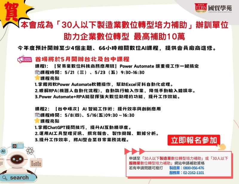 本會今年度預計開辦開設至少4個主題、66小時相關數位AI課程,提供企業進修。首場將於5月開辦,除台北之外,為服務中南部會員,特加開台中場次,歡迎大家踴躍報名。