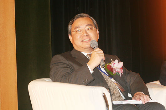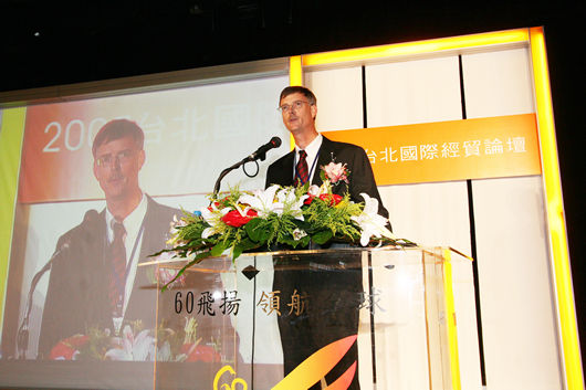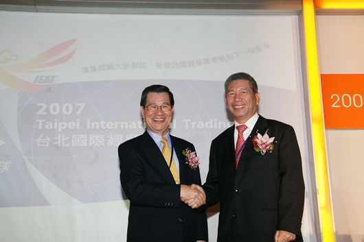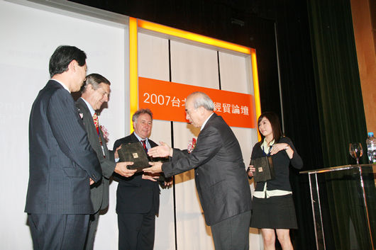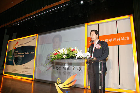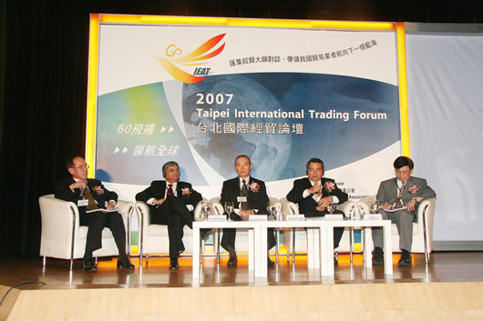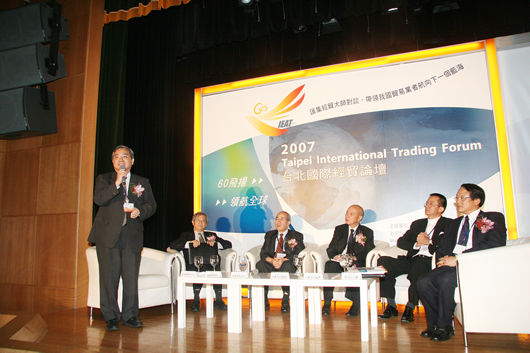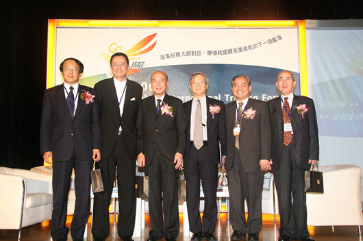 第四場論壇:洞悉台灣貿易業的利基及未來發展(引言人:黃常務理事呈琮、主持人:經濟部國際貿易局黃局長志鵬、與談人:全威國際控股集團王董事長祿誾、高林實業股份有限公司李董事長錫祿、六和化工股份有限公司李董事長世文、台灣大學管理學院湯教授明哲)