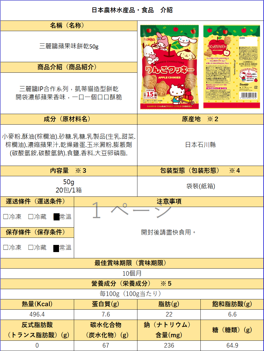進口代理—日本金澤—「北陸製菓株式會社」三麗鷗蘋果味餅乾