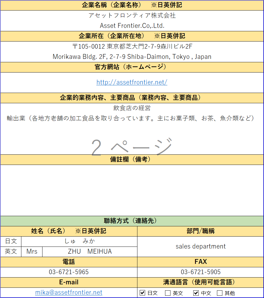 - 公司所在:東京都芝大門2-7-9森川ビル2F