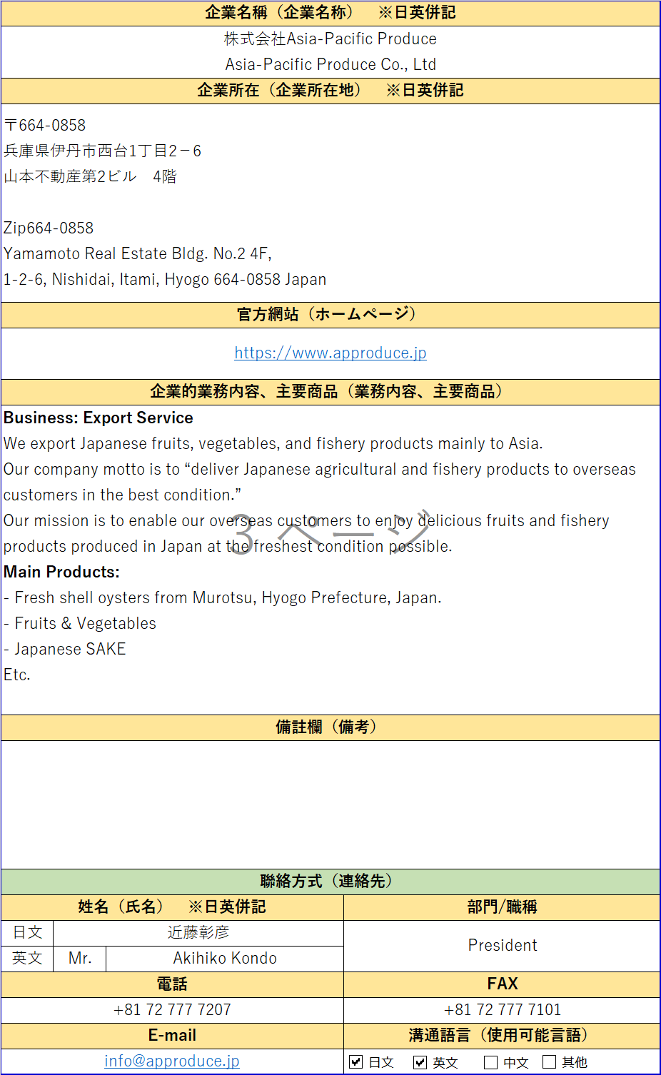 - 公司名稱:株式會社Asia-Pacific Produce