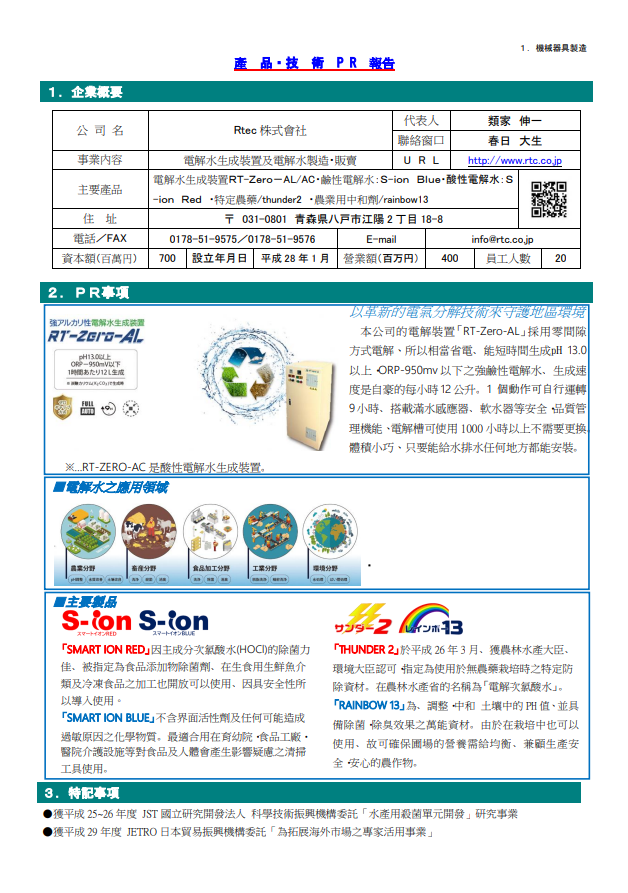 進口代理—日本青森—「Rtec株式會社」電解水生成裝置・電解水・特定農藥