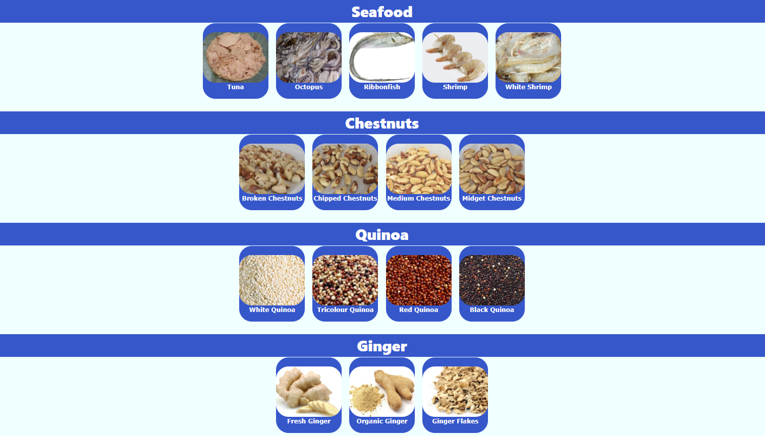 Products:Dry Blue Shark Fins, Scallops, Sea Urchin Tongues, Flying Fish Roes, Pepinos Secos de Mar, Dry Sea Cucumbers, Giant Squids
