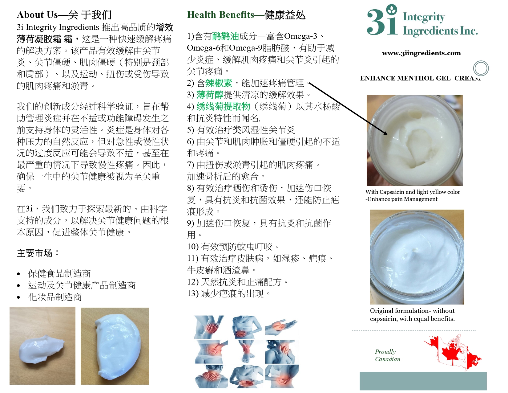 3i Integrity Ingredients 為高品質的 Booster Peppermint Gel Cream 乳霜原料製造商。致力於研發獨特且天然的原料配方用於舒緩因關節炎、關節僵硬、肌肉僵硬 (尤其是頸部和肩膀),以及運動、扭傷或受傷所引起的肌肉疼痛和瘀傷。