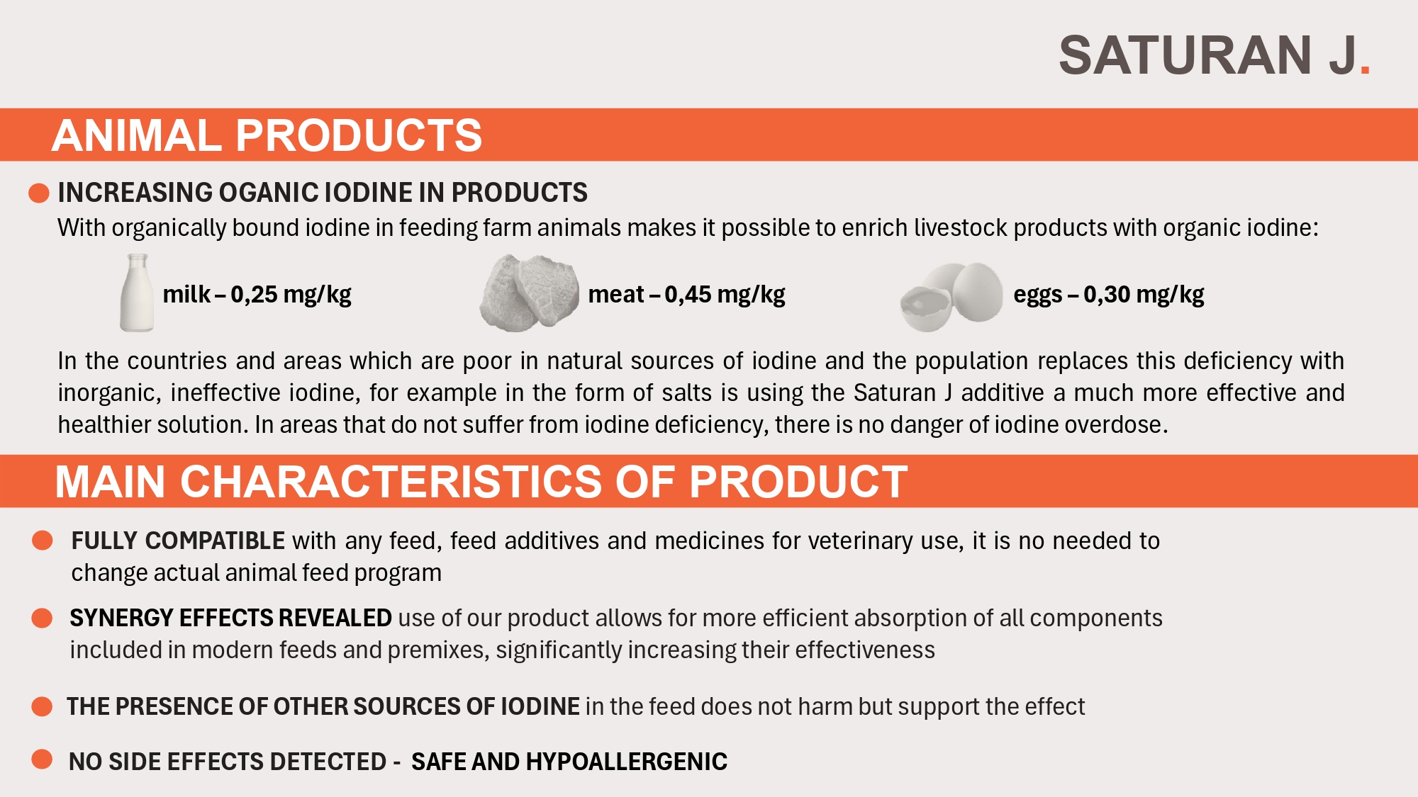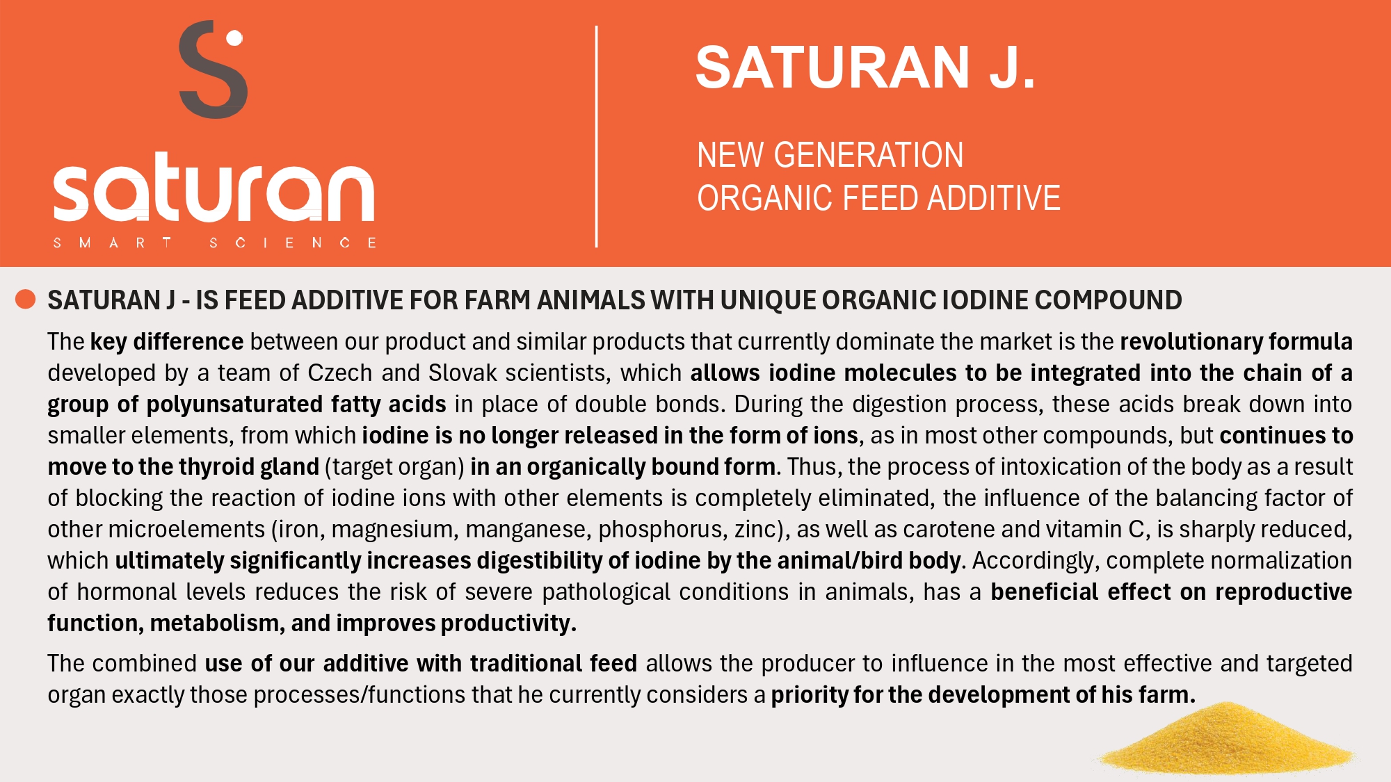 SATURAN J is a feed additive designed for farm animals, featuring a unique organic iodine compound. This compound significantly enhances the absorption of iodine by the animal's body, providing benefits for reproductive health, metabolism, and overall productivity. Farmers have reported improvements in efficiency across various livestock sectors, including cattle, pigs, and poultry.