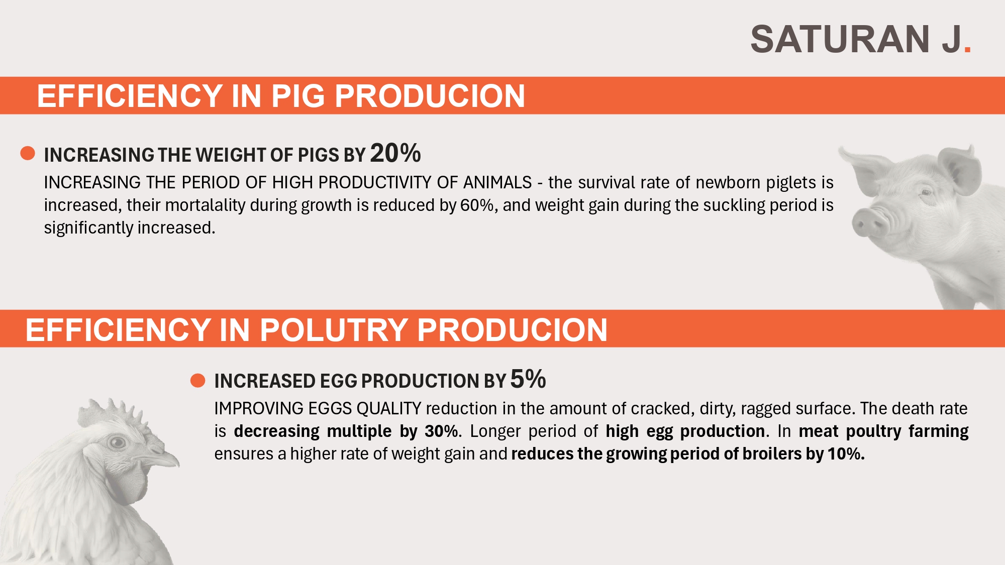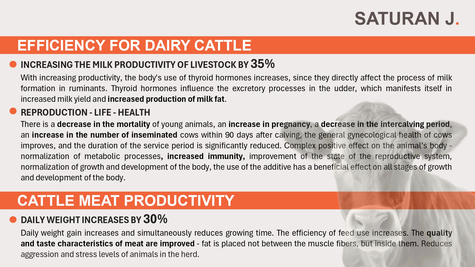 在牛隻中,使用SATURAN J的奶牛生產力提高了最高達35%,每日體重增長達30%。在豬隻中,體重增加了20%,而在家禽中,不僅蛋產量提高了5%,死亡率也降低了30%。有機結合碘的使用,使牲畜產品能夠富含有機碘,從而提供更健康、更有效的解決方案。