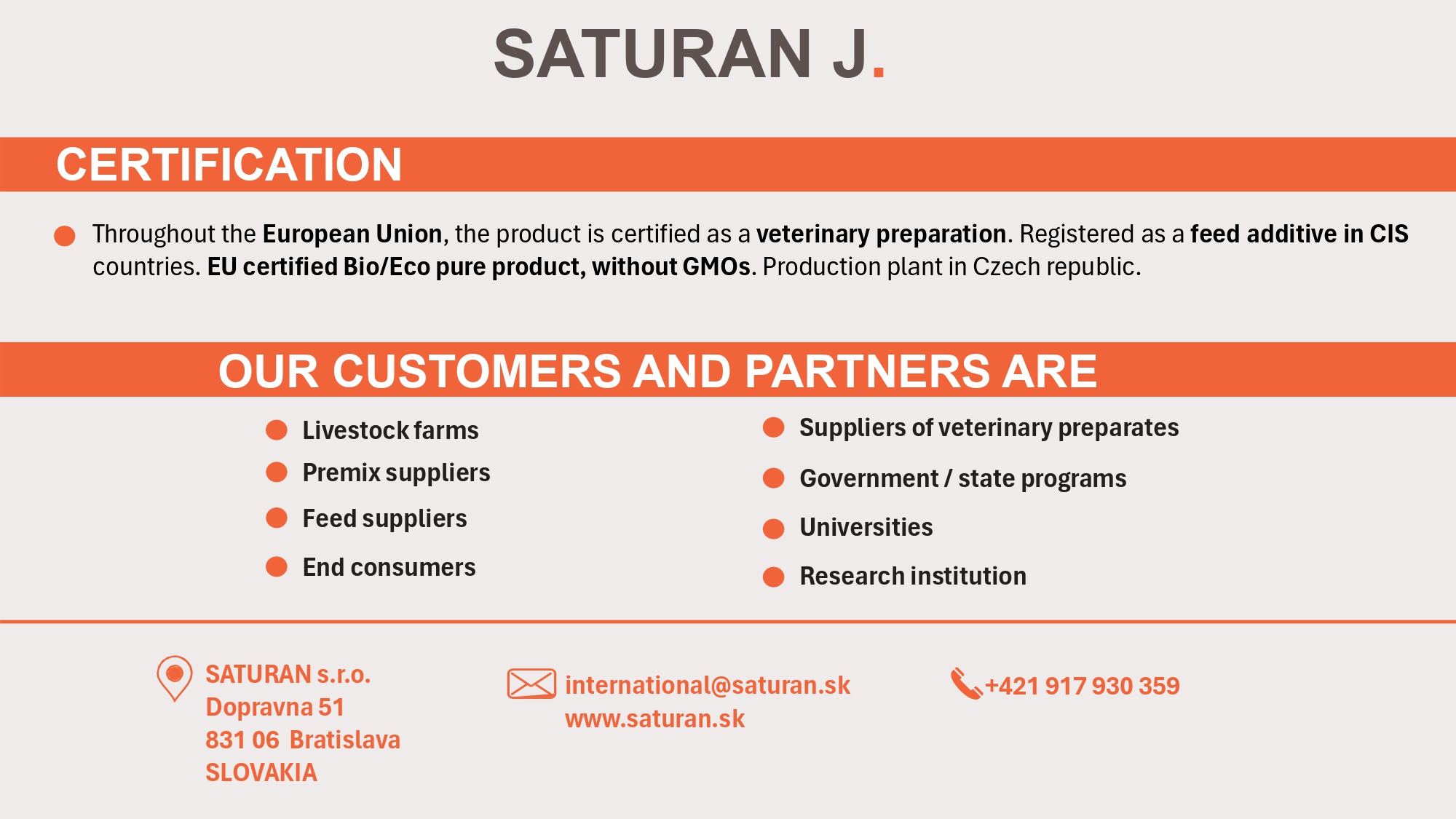SATURAN J is certified as a veterinary preparation throughout the European Union and is registered as a feed additive in CIS countries. It is an EU-certified Bio/Eco product, free from GMOs.