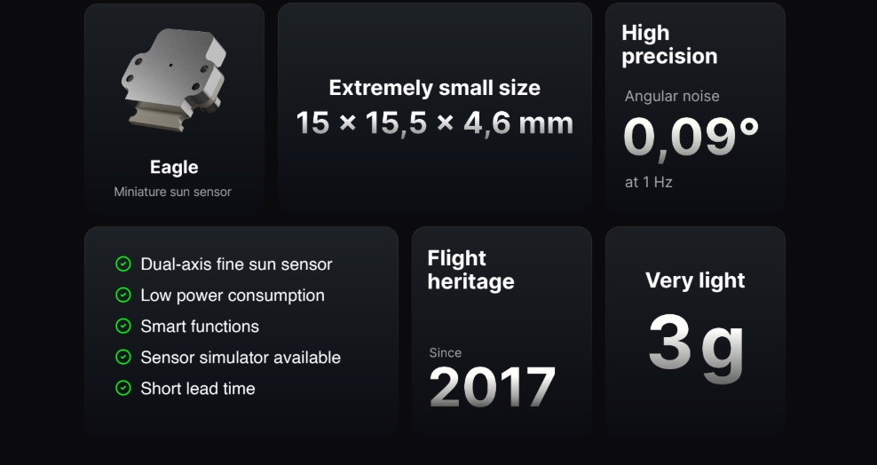 其「Eagle」感測器比業界領先者小43%,尺寸僅為15 x 15.5 x 4.6 毫米,重僅3克。儘管體積小巧,該感測器仍能提供高精度,角噪聲僅為0.09度(在1Hz下)。這種輕量化設計使感測器可以輕鬆地安裝於衛星的太陽能板之間。此外,Needronix的Eagle感測器僅消耗7毫瓦,僅為競爭對手40毫瓦功率的1/6。