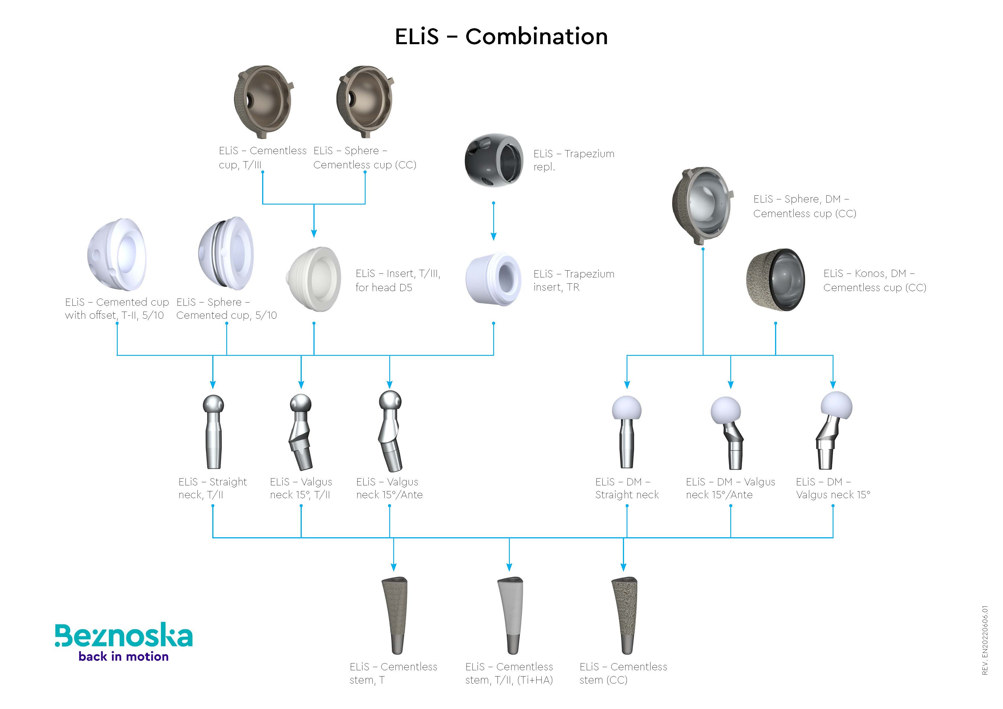 提供水泥與無水泥設計,涵蓋 BEZNOSKA、CSB、TRIO、DUO 等系列,搭配陶瓷與金屬關節頭,適用於初次與複雜修復需求。