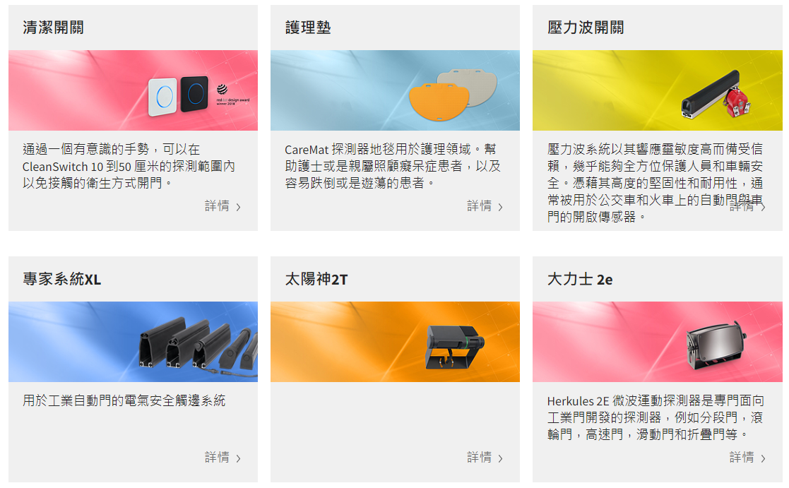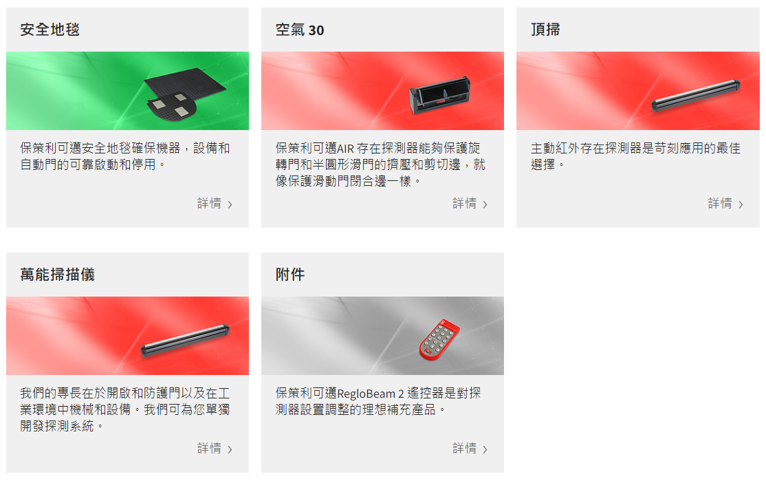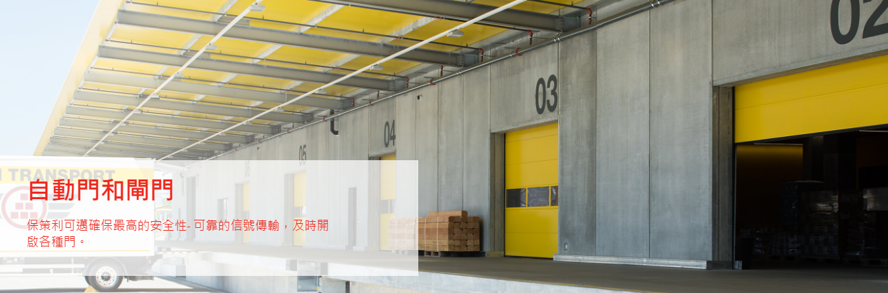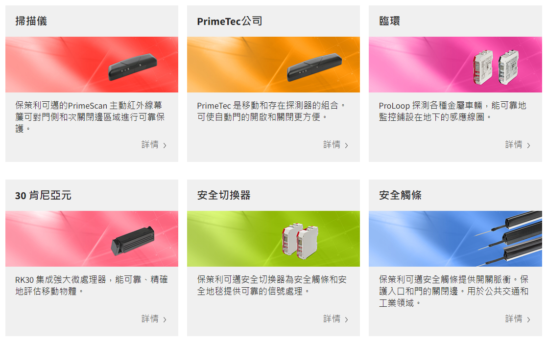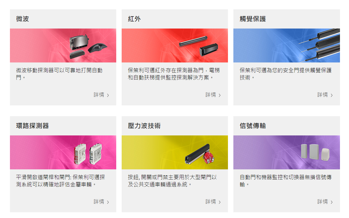滿懷極大地熱情和創新精神,保策利可邁為您的自動門開發了現代化的便利和安全系統。環路探測器,微波移動探測器和紅外移動探測器提供開啟脈衝,安全觸條和存在探測器用於保護主次閉合邊。另外,保策利可邁還提供多種無線和感應信號傳輸系統。對於叉車,機器和公共交通車輛,保策利可邁為其提供了先進性的解決方案,例如安全觸條,安全地毯以及腳踏地毯。在醫療保健領域,安全地毯是照顧癡呆和容易遊蕩病人的有效技術解決方案。