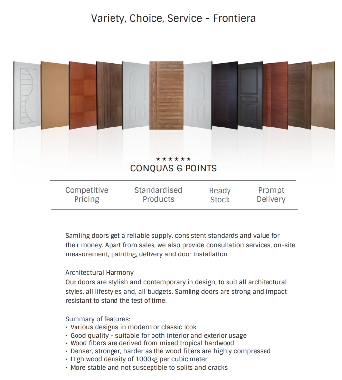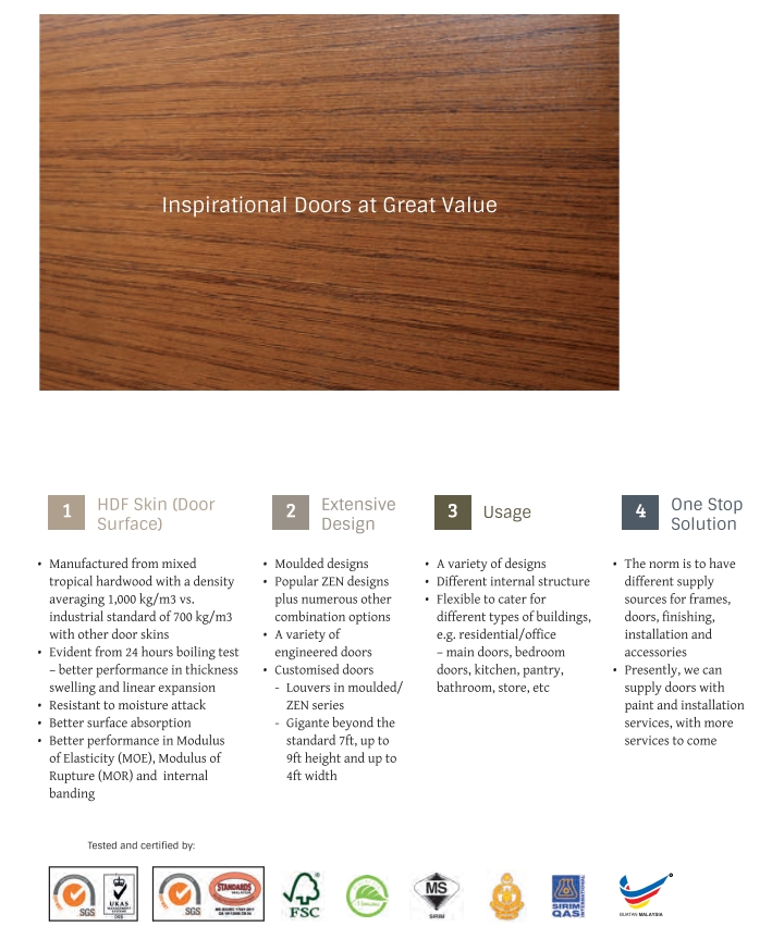- Classic Door Series, ZEN Door Series, Tru Oak Door Series, Flat Oak Door Series, HDF Plain Door Series, Veneer Door Series, Japan Eco Premium Surface Series, Special Door Series, Sarawak Door Series.